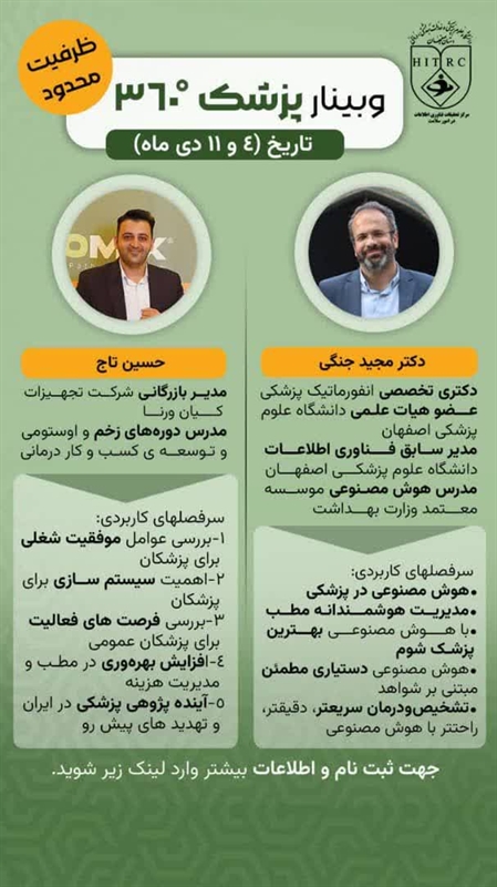 وبینار پزشک ۳۶۰ مرکز تحقیقات فناوری اطلاعات در امور سلامت دانشگاه علوم‌پزشکی اصفهان برگزار می‌کند‌.