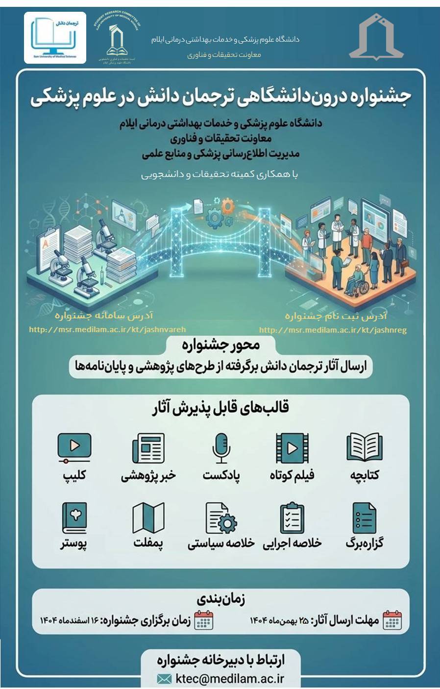 با توجه به اهميت روزافزون اين موضوع، جشنواره ترجمان دانش دانشگاه علوم پزشكي ايلام با هدف ترويج فرهنگ ترجمان دانش، ارتقاي مهارتهاي ارتباط علمي و تشويق به ارائه ايدهها و محصولات خلاقانه در اين حوزه برگزار ميشود. اين جشنواره بستري مناسب براي آشنايي اعضاي هيئت علمي، پژوهشگران، دانشجويان و كاركنان دانشگاه با اصول، ابزارها و قالبهاي متنوع ترجمان دانش فراهم ميآورد و زمينهاي براي تبديل دستاوردهاي پژوهشي به پيامهايي قابل فهم و اثرگذار ايجاد ميكند.